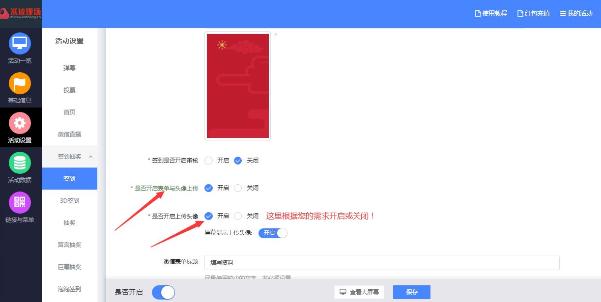 头像上传的意思就是签到时上传自己的照片,不使用默认的微信头像,不用上传可以关闭此选项) “是否开启审核”这个不要动。默认关闭就可以了。