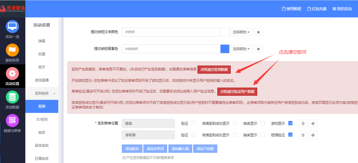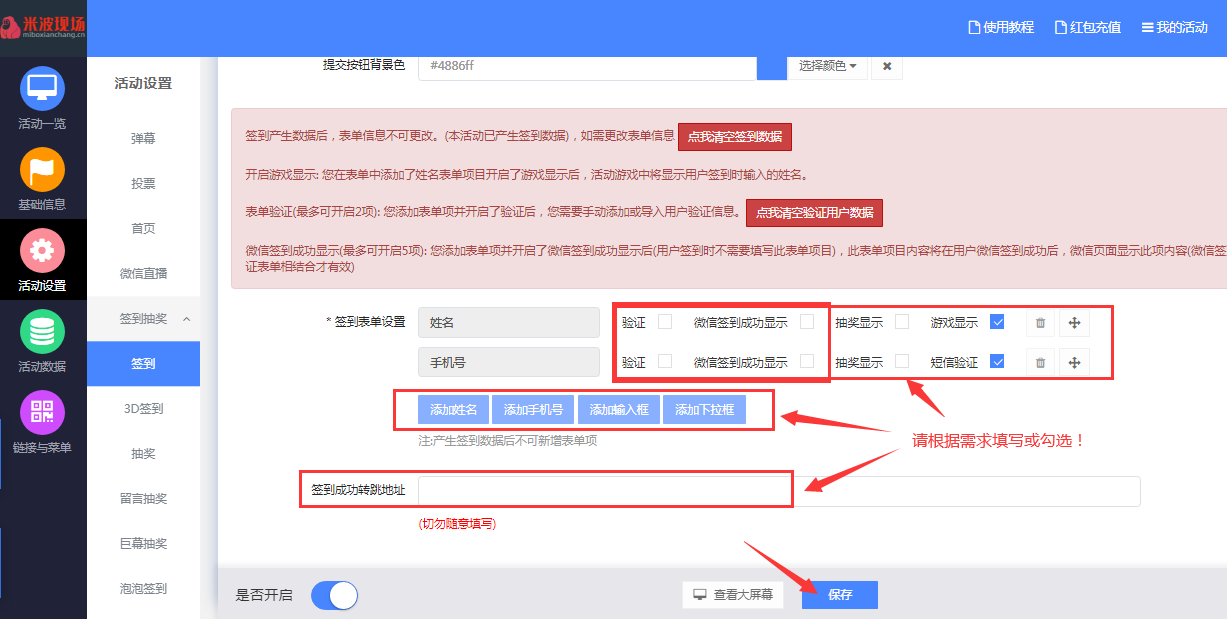 添加姓名,添加手机号,添加输入框等选项,选择相应需要输入的内容(切记如果没有需求不要勾选:验证和微信签到成功显示两个选项,签到成功地址也不要填写) 在点击