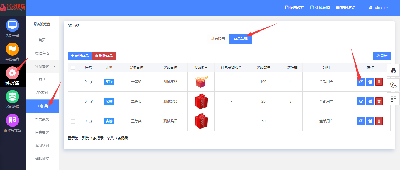 特别注意:设置签到输入信息以后,一定要去3D抽奖设置里面把奖品的抽奖名单改成签到用户!步骤如下: