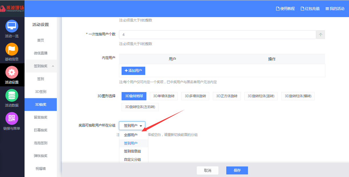 依次点击:3D抽奖设置--奖品管理--编辑奖项,然后拉到最后选择抽奖所在分组,选择签到用户。点击保存。一定要都换哦。。如下图: